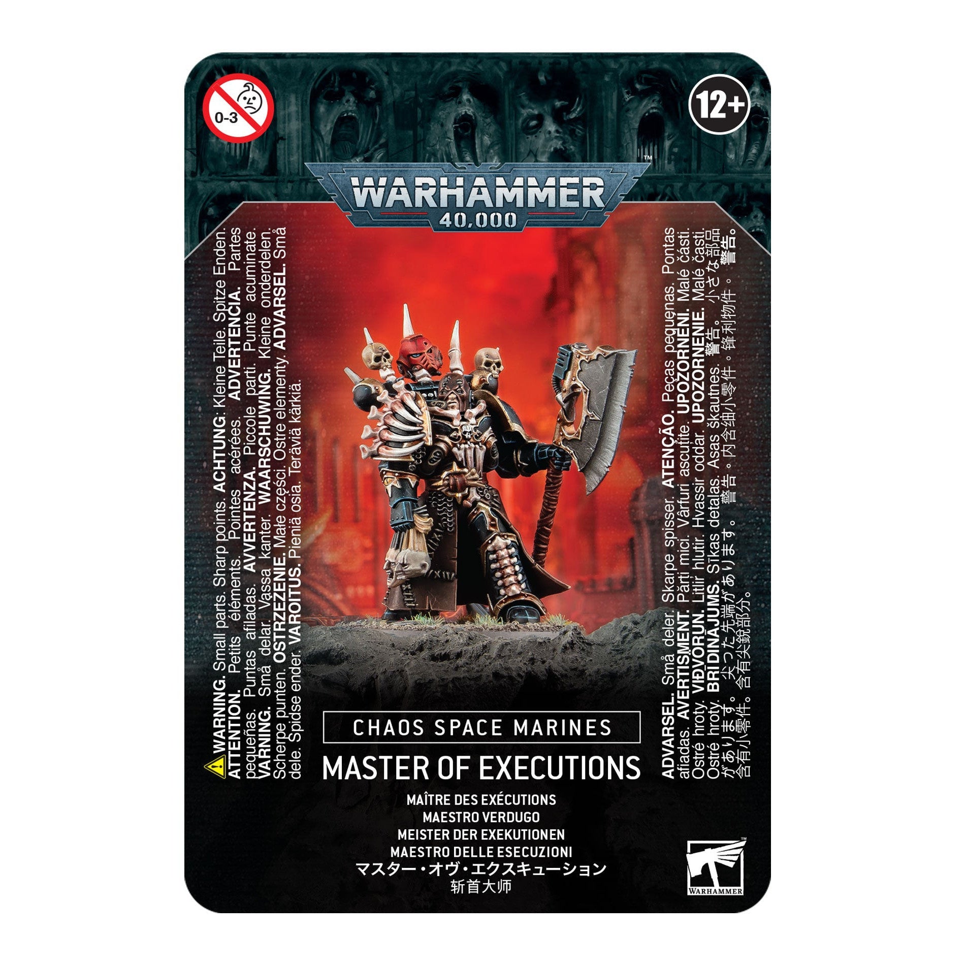 This multipart plastic kit builds a Master of Executions – a bloodthirsty Heretic Astartes driven to seek worthy foes. Armed with his fearsome and enormous axe of dismemberment, he displays all the grisly hallmarks of an executioner, including a trophy rack, skeletal decorations draped across his armour, and a pair of recently-decapitated heads clutched in his right hand. The kit also offers a choice of heads – a grim executioner's hood, or a mutilated and skull-faced bare head.